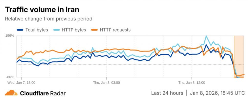 طبق داده‌های نت‌بلاکس و رادار کلادفلر، اینترنت ایران طی ساعات گذشته با اختلال‌های جدی مواجه شده است. نت‌بلاکس براساس این اطلاعات، وضعیت ایران را شروعی بر «خاموشی دیجیتال» توصیف کرده است.