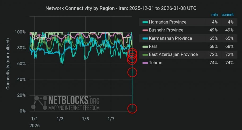 نت‌بلاکس با به‌روزرسانی براساس داده‌های زنده از وضعیت اینترنت ایران، می‌گوید «تهران و بخش‌های دیگری از ایران وارد فاز خاموشی دیجیتال شده» و وضعیت وصل شدنات در چندین ارائه‌دهنده، کاهش یافته است.
