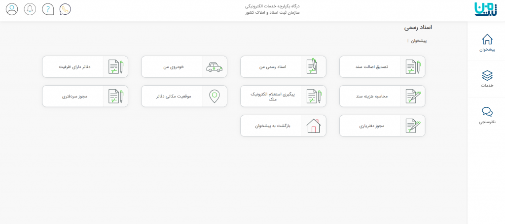 امکانات این بخش شامل اسناد رسمی من است که تمامی وکالت‌نامه‌ها، رضایت‌نامه‌ها و تعهدنامه‌هایی که از سال ۱۳۹۲ به بعد در دفاتر اسناد رسمی به نام شخص ثبت شده است را نشان می‌دهد. پیگیری وضعیت استعلام‌های الکترونیک ملک و نیز بررسی کردن اعتبار وکالت‌نامه‌ها و اسناد محضری در بخش تصدیق اصالت اسناد از دیگر یوزردهای این پیشخوان است.