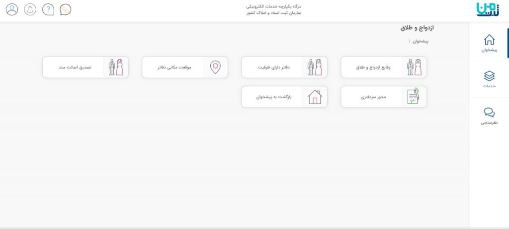 پیشخوان ازدواج و طلاق کلیه وقایع ازدواج و طلاق ثبت شده برای شخص را در دفاتر ازدواج و طلاق از سال ۱۳۹۲ نشان دادن می‌دهد. نیز قابلیت پیدا کردن موقعیت مکانی این دفاتر نیز در این پیشخوان هست. گزینه دیگر در این پیشخوان، نشان دادن فهرستی از دفاتر طلاق که ظرفیت ثبت واقعه طلاق در آن دفاتر به اتمام نرسیده است.