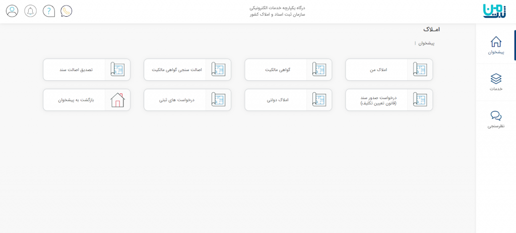 زمانی که وارد این پیشخوان شوید گزینه‌های مختلفی را دیدن خواهید کرد. در بخش املاک من لیست املاکی که دارای سند مالکیت هستند و در سامانه جامع املاک داده آمایی شده‌اند، وجود دارند. بخش خوداظهاری املاک نیز برای کنترل و تثبیت مالکیت اشخاص و ارتقا ضریب قطعیت در صحت اطلاعات قرار داده شده است. نیز گزینه املاک دولتی مورد استفاده وزارت اقتصاد و دارایی قرار می‌گیرد.