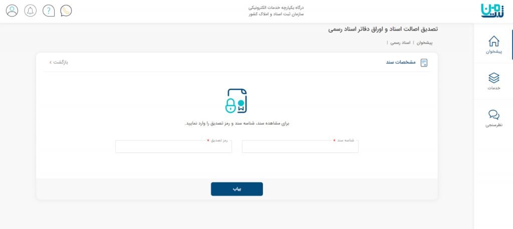 استفاده از خدمات شخصی در این درگاه نیازمند ایجاد حساب یوزری است، اما برخی خدمات عمومی مانند تصدیق اصالت سند ممکن است بدون نیاز به لاگین نیز در دسترس باشند.
