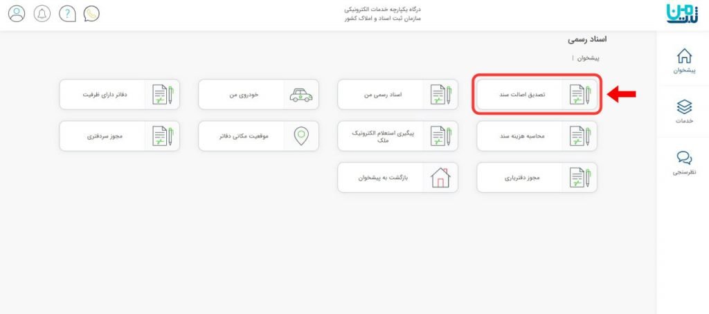برای استعلام سند ملک ابتدا به بخش اسناد رسمی وارد شوید. سپس گزینه تصدیق اصالت سند را برای اسناد خود انتخاب کنید.