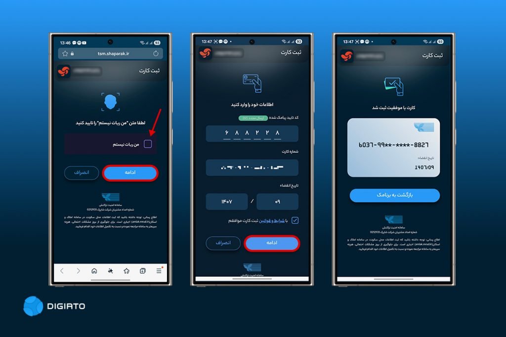 برای انجام این فرایند، نیازی به مراجعه به سایت shaparak.ir نیست؛ بلکه باید با اپلیکیشن‌های خرید موبایلی دارای مجوز مانند آپ، ایوا، ۷۲۴، تاپ یا سکه اقدام کرد. در همه این برنامه‌ها، مراحل ثبت کارت تقریباً مشابه است و شامل وارد کردن اطلاعات کارت، تایید شماره موبایل و احراز هویت با نوتیفیکیشنک شاپرک می‌شود.