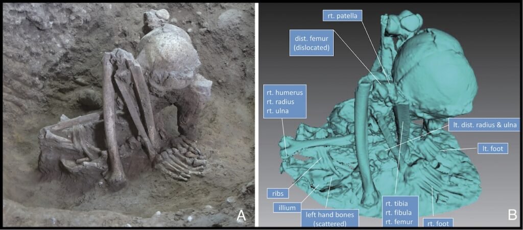 این وضعیت غیرطبیعی نشان می‌دهد که بدن پس از مرگ به شکلی خاص آماده‌سازی شده است. محققان سرنخ‌هایی از سوختگی روی استخوان‌ها دیدن کرده‌اند که نشان‌دهنده یک آیین تدفین خاص با استفاده از آتش است.