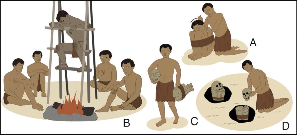 سناریویی که محققان احتمال می‌دهند طی آن اجساد با دود و آتش مومیایی می‌شدند. روش بستن جسد ممکن است به حالت جنینی (A) یا باز باشد (B).